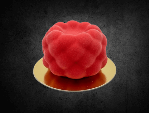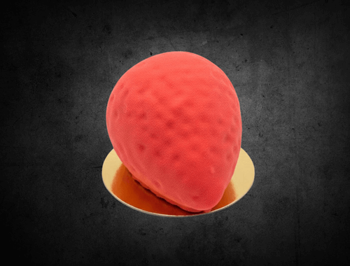 Whipganache van ruby chocolade, frambozen compote, amandelcake.